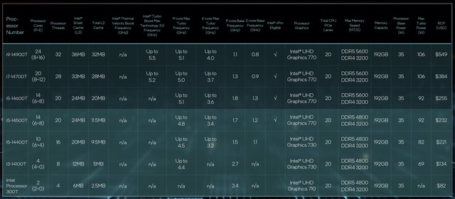 其中,无尾标志是自带核显示器的型号,这次共有7款,包括6款酷睿和一款IntelProcessor。最高型号为酷睿i9-14900,该处理器具有24核32线程,最大瑞频5.8Ghz,自带UHD770核心显卡。酷睿最入门的型号是i3-14100,没有性能混合架构设计,有4个核心8线程,最大瑞频4.7GHz,自带UHD730核显。IntelProcessor推出了IntelProcessor300,拥有2核心4线程,最大瑞频3.9GHz,自带UHD710核显。
