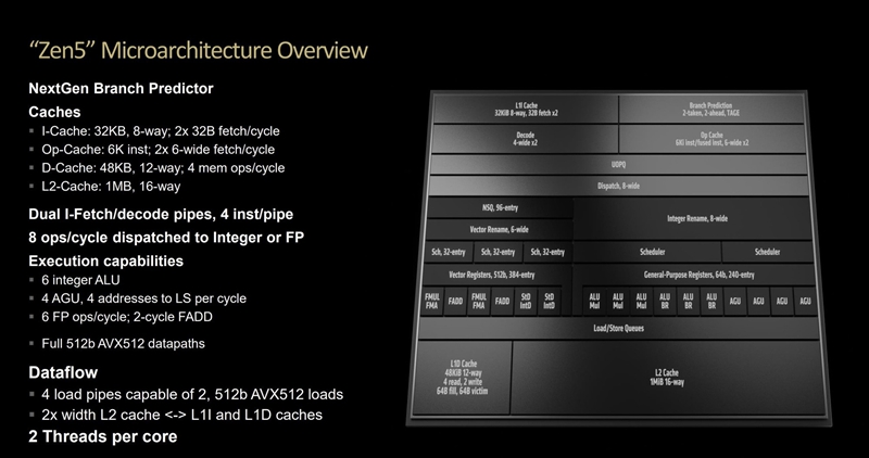 同时Zen5在整数运算部分也得到了加强。处理器现在可以一次处理更多指令,从每时钟周期6条指令增加到8条。以前Zen架构中的整数运算单元有4个算术逻辑单元(ALU)和3个地址生成单元(AGU),而现在Zen 5增加到了6个ALU和4个AGU。这些单元都配有一个统一的调度器,使得处理器可以在处理多核复杂任务时更加高效。