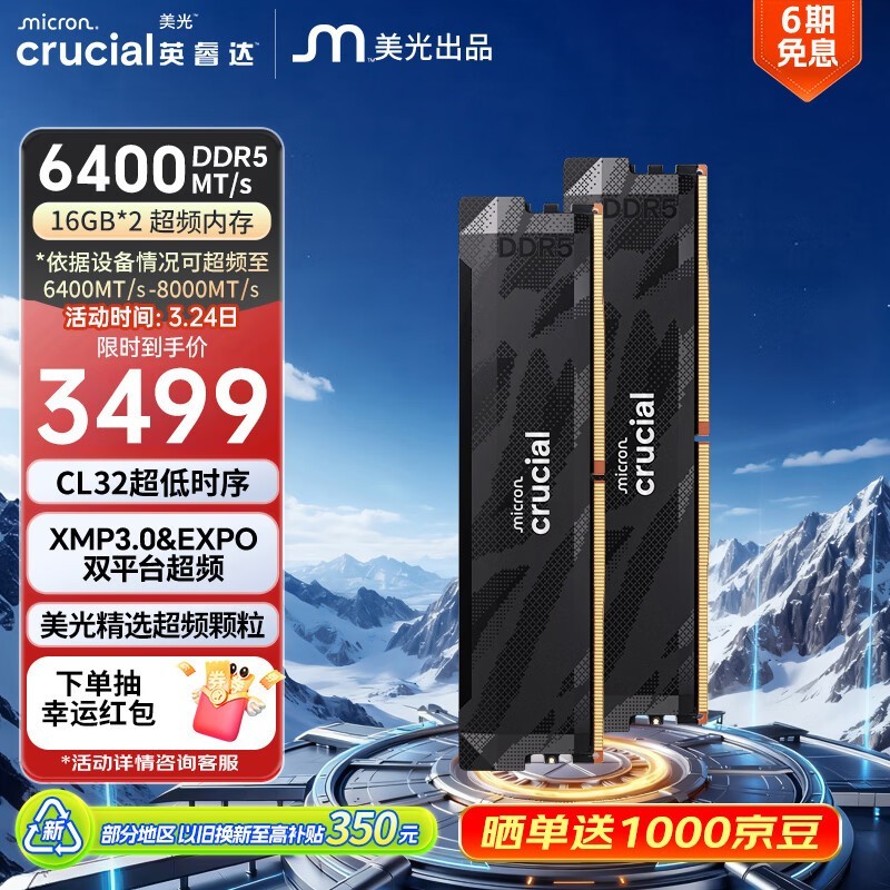 英睿达 32GB DDR5 6400 内存条 黑色 京东自营 限时仅需3499元
