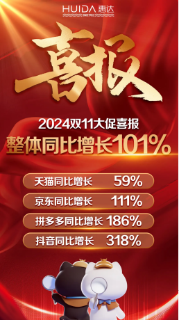 11月13日,惠达卫浴发布的喜报显示,2024年双11大促期间,其整体销售额同比增长了101%。在各电商平台的数据对比中,惠达的成绩更是尤为突出:天猫同比增长59%,京东同比增长111%,拼多多同比增长186%,抖音同比增长318%。