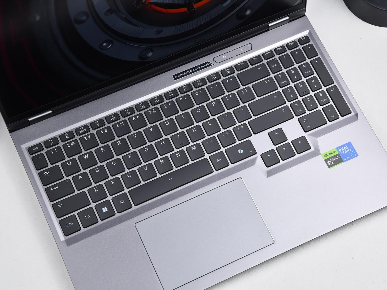 机械革命耀世16 Ultra键盘手感出色,方向键也采用了全高设计。右上角设计有独立的电源键和性能模式快速切换键,同时带有独立数字键区。其触控板和腕托面积都非常大,前者也没有为了追求腕托对称而放在腕托中间,而是考虑到操控体验放在了空格键正下方。