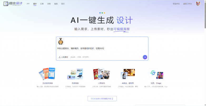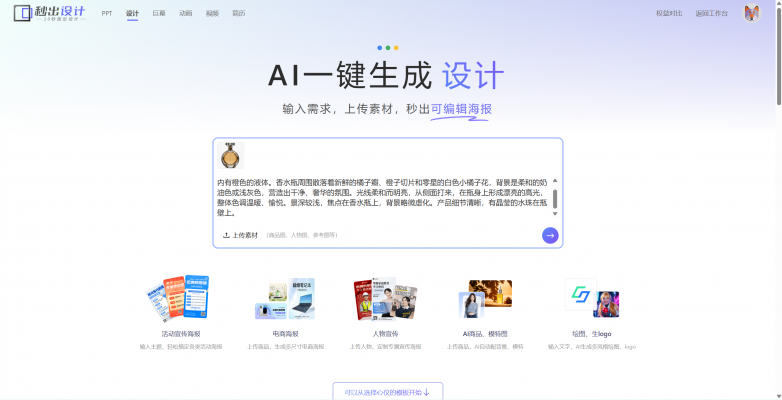 我们所用到的工具就是秒出设计——一款AI制作海报工具,包括我们的电商、邀请函、宣传海报等等不同的类型。接下来我们就来详细看看操作流程吧!