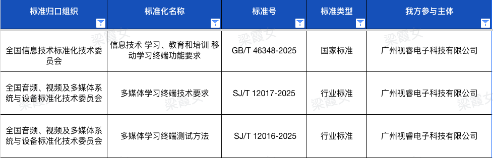 在国家标准层面,视源股份旗下希沃作为核心起草单位之一,深度参与了《信息技术学习、教育和培训 移动学习终端功能要求》(GB/T 46348-2025)的制定工作。该标准由全国信息技术标准化技术委员会归口,由清华大学、北京高等教育学会等全国20多家高校、科研院所和企业参与研制,是国内移动学习终端领域的重要技术规范。