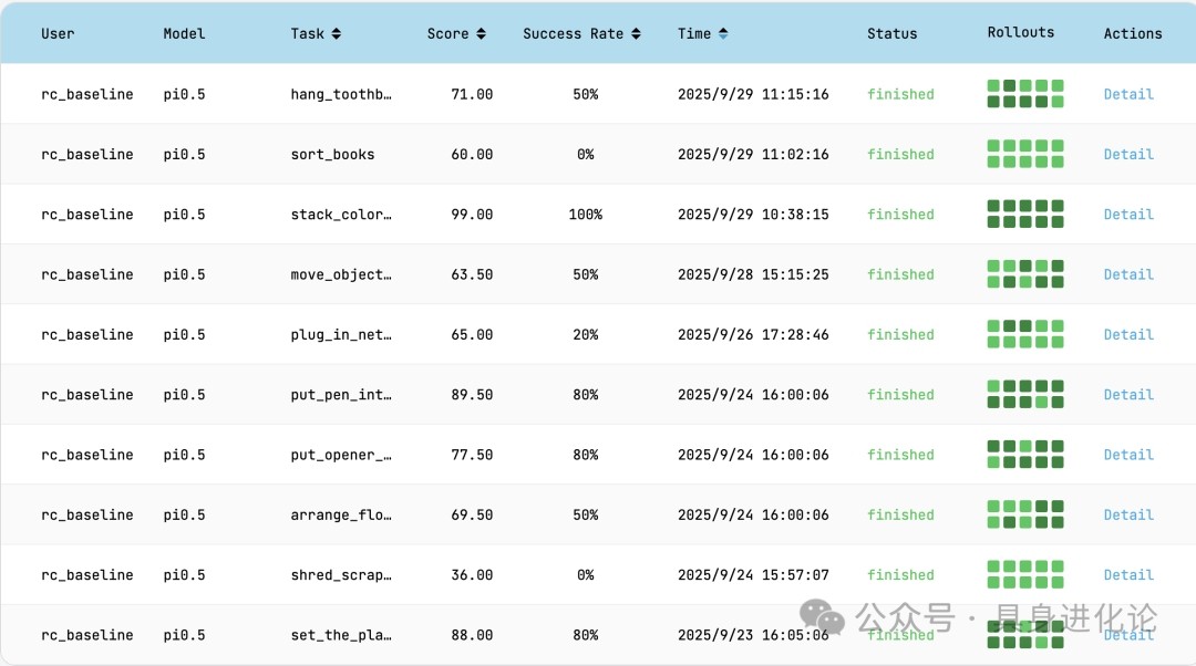 在该评测体系中,多款主流开源模型已完成测试。“具身进化论”对比发现,基于Physical Intelligence (Pi)系列构建的π0和π0.5是官方重点基线,它们在成功率与进度得分上整体领先其他开源模型,特别是π0.5,显示出更成熟的任务执行能力。