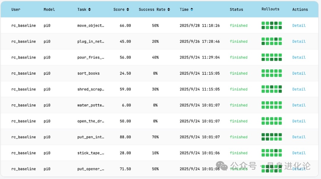 “具身进化论”从进度分情况看到,模型虽然在部分任务中能完成初段动作,但多数情况下未能完成关键步骤,执行链条往往在中段被迫中断。这与平台强调的“多阶段连续操作能力”形成明显差距。