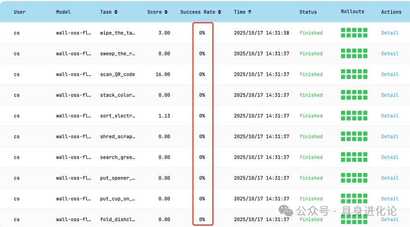 相比之下,自变量的wall-oss-flow 在相同条件下的表现明显偏弱。测评结果显示:wall-oss-flow共测试31次,其中2次成功率为60%,1次成功率为50%,1次成功率为20%,其余所有任务成功率均为0。