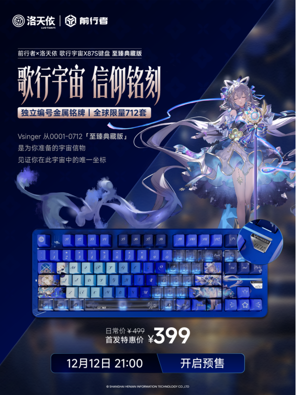 结语:一场预定爆款的诞生12月12日21:00,前行者×洛天依歌行宇宙X87S键盘将正式开启预售。其中,仅712套的至臻典藏版,因其独特的独立编号和深厚的粉丝情感附加值,注定成为今年最具话题性与收藏价值的外设单品之一。预售前便在闲鱼等平台形成的求购热潮,已提前印证了其市场号召力。这不仅是前行者品牌的一次高光时刻,更是外设行业深度挖掘情感价值、实现破圈共鸣的典范案例。