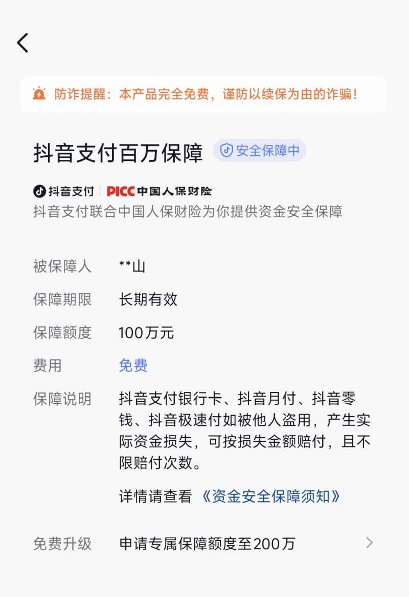 抖音支付联合中国人保财险为我们免费开通的“百万保障”,账户若因盗用导致资金损失,按实际金额不限次赔付,年累计上限100万元。而且“百万保障”是长期有效且免费的。