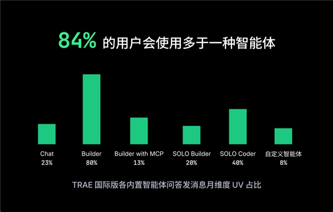 用户在 SOLO 中通过智能对话解决复杂问题,有效融入日常开发工作流。TRAE 国际版 SOLO 模式从 Beta 版发布至正式版上线,用户累计渗透率达 44%,问答规模增长 1300%。TRAE 中国版 SOLO 上线后,每 10 位 TRAE 开发者中就有 3 位采用 SOLO。