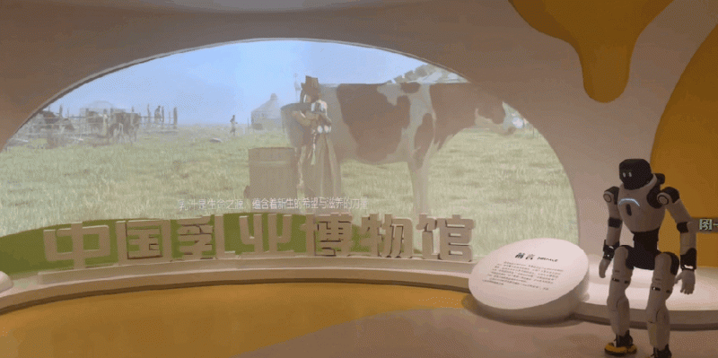 跟随机器人导览的视角,博物馆的核心展陈得以清晰呈现。在“一滴奶的‘冒险旅程’”展区,通过超大屏幕的沉浸式体验,参观者可直观了解牛奶从牧场到餐桌的全过程,展现自然与科技智慧的结合。