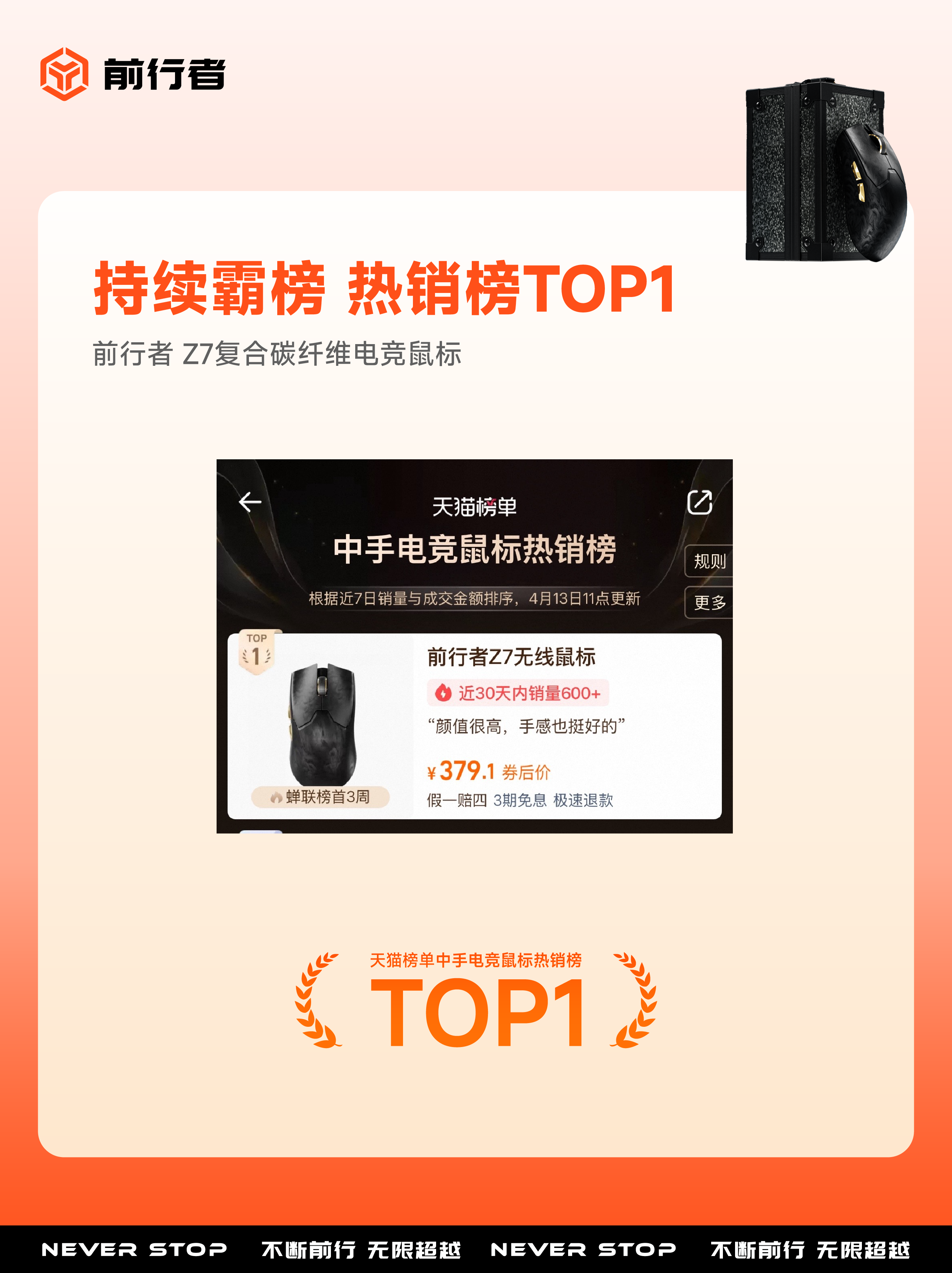 2026 年 4 月 11-14 日,全球瞩目的环球资源香港展在香港亚洲国际博览馆盛大启幕。国产专业电竞外设品牌前行者(EWEADN) 携年度旗舰力作Z7 碳纤维电竞鼠标惊艳参展,凭借卓越的产品实力与极致的用户口碑,在展会同期举办的 KOL 暨买家游戏外设最佳人气投选活动中脱颖而出,荣获KOL 暨买家游戏外设最佳人气第一名,与此同时,Z7 在国内电商平台持续领跑,长期霸榜天猫重手电竞鼠标热销榜 TOP1,以国际权威认可与市场热销的双重佳绩,再次印证前行者在电竞外设领域的硬核实力与标杆地位。