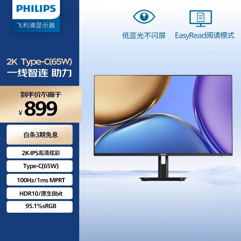 飞利浦 27E1N1620 27英寸 2K IPS 100Hz HDR TypeC65W 三面窄边框设计 低蓝光不闪屏 办公显示器