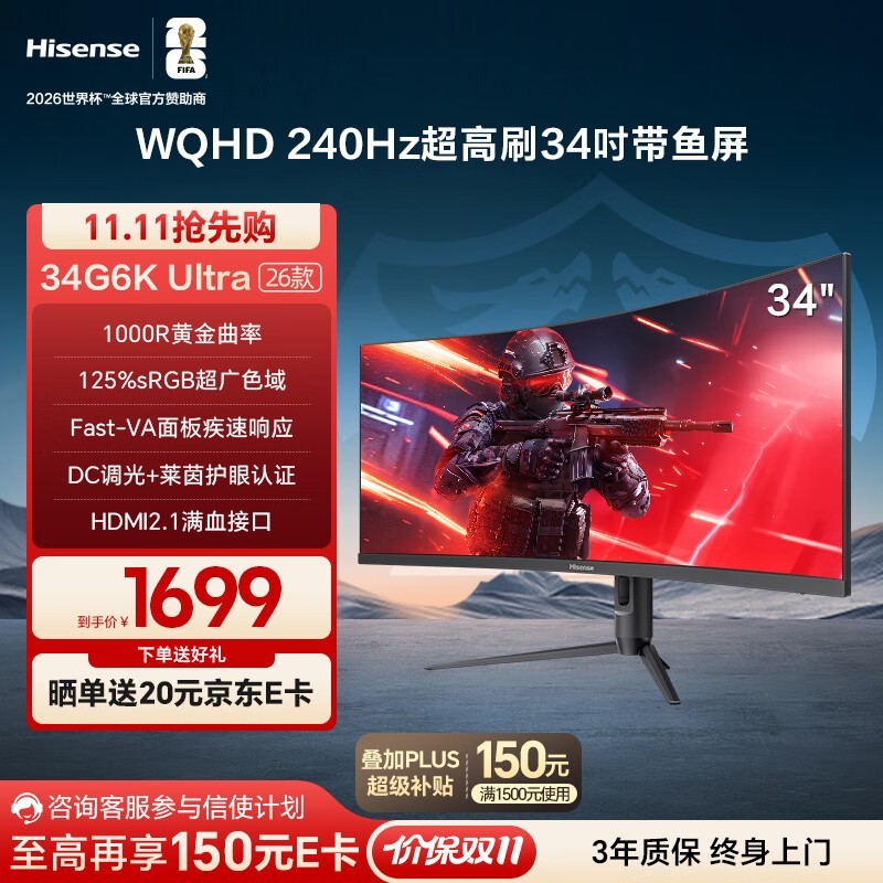 海信 34G6K Ultra 34英寸带鱼屏显示器 240Hz高刷 1000R曲率 内置音响 HDR400 WQHD曲面电竞屏