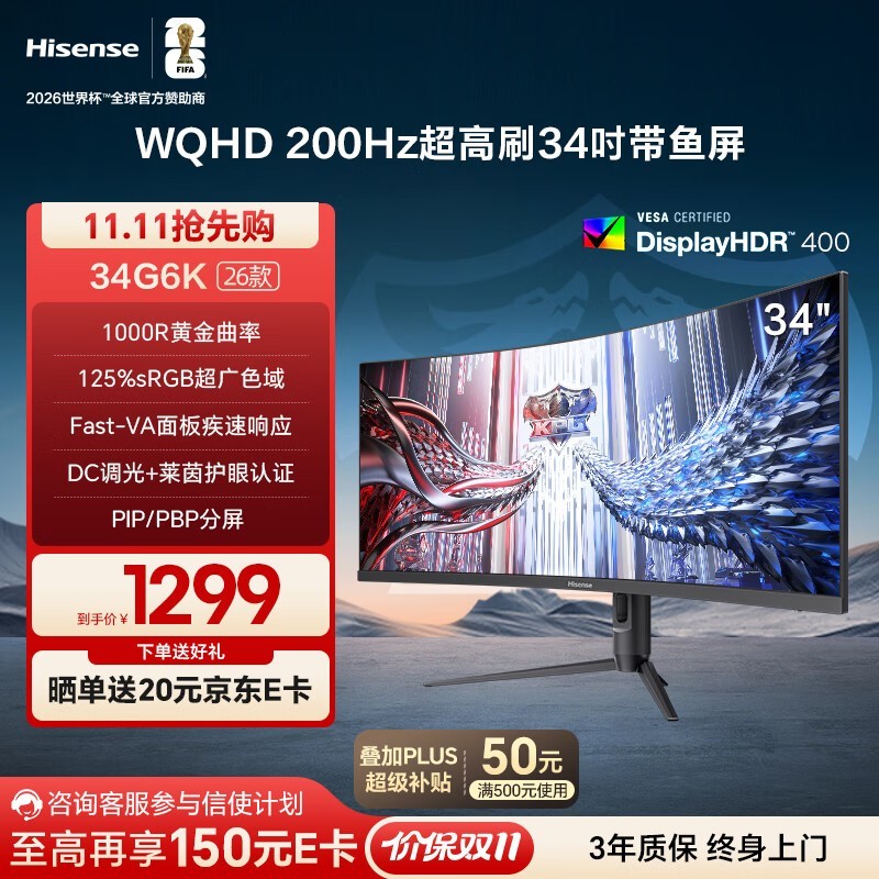海信 34G6K 34英寸曲面显示器,采用VA面板带来沉浸式视觉体验,3440×1440超清分辨率搭配165Hz高刷新率,画面流畅顺滑,无论是游戏还是观影都更加畅快;支持Adaptive Sync技术有效减少画面撕裂,提升操作响应速度,配合3000R曲率设计贴合人眼视野,带来更舒适的观看感受;覆盖125%sRGB色域并支持HDR400,色彩表现丰富真实,细节层次分明;现京东活动售价1299元,叠加满500减50优惠券,参与平台20%起补贴立减249.8元,晒单再返20元E卡,实付低至979.2元,国补专属优惠限上海福建地区,高品质带鱼屏低价入手正当时。