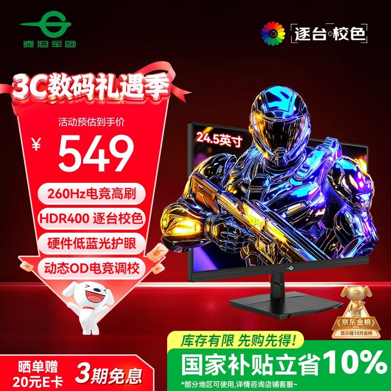 泰坦军团 P2510H PLUS 的官方定价在549元左右。然而,在近期的电商促销活动中,通过参与“国家补贴”(立减10%)以及晒单返E卡等优惠,其到手价可低至 464.05元。这个价格在24.5英寸、260Hz高刷的Fast IPS显示器市场中极具杀伤力。