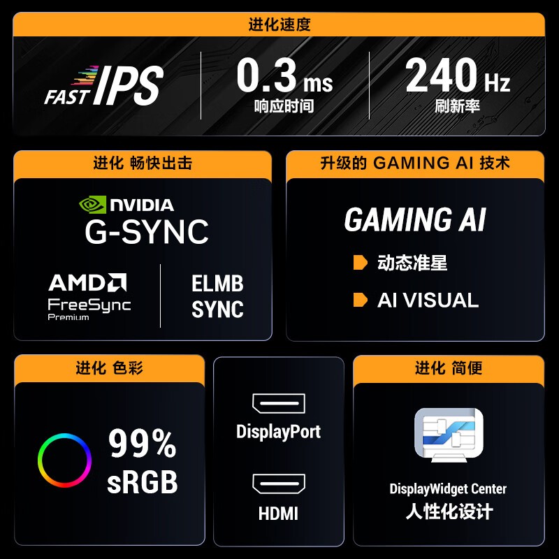 华硕 VG279QM5A 采用 27 英寸 FastIPS 面板,具备 1920×1080 分辨率与 240Hz 刷新率,结合 1ms GTG 响应时间,有效消除高速画面拖影与撕裂,提升竞技游戏流畅度。其 99% sRGB 色域保障色彩鲜活,178° 广视角确保侧视无色偏。屏幕经低蓝光与不闪屏护眼调校,缓解长时间使用疲劳。华硕 VG279QM5A 在动态表现与视觉舒适度上达成兼顾。