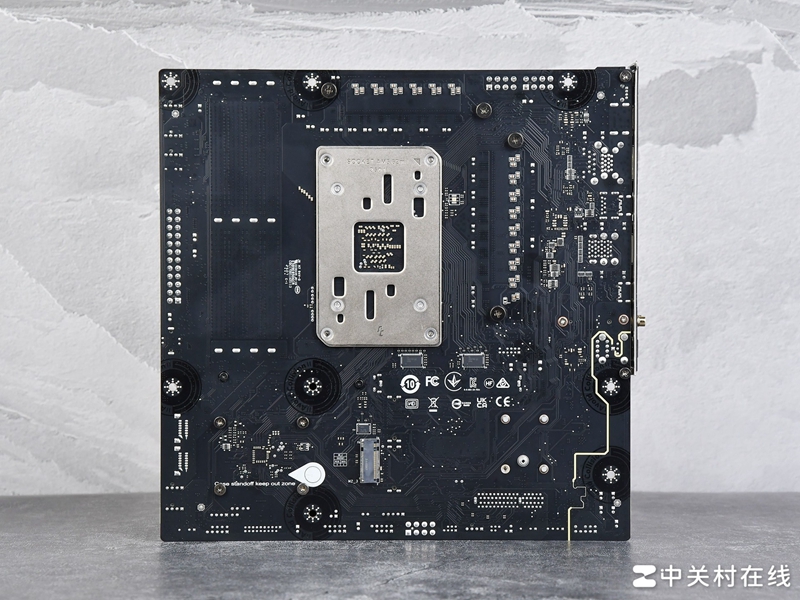 这款主板散热片背面配备大面积导热垫,主要给MOSFET传导热量。