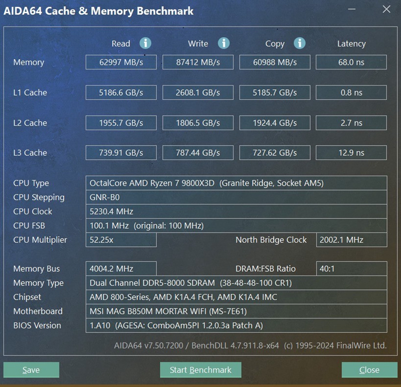 这套XMP 8000MT/s内存在微星 B850M MORTAR WIFI迫击炮主板上,读取达到59230MB/s,写入达到85788MB/s,延迟为75.3ns,此时为默认跑分表现,下面我们在看一下开启Memory Timing Preset内存一键小参优化功能后读写性能的变化,设置档位为好香(Relax)。