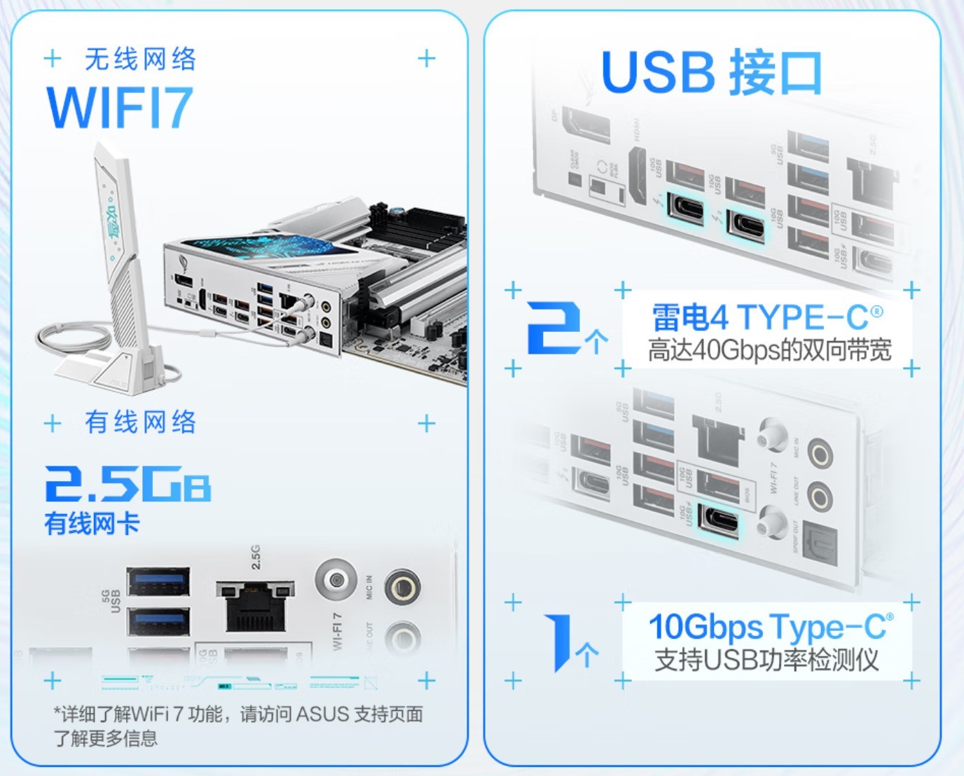 华硕 Z890-A GAMING WIFI S附加功能上,网络搭载WiFi7与2.5Gb有线网卡,I/O 接口含2个40Gbps雷电4 Type-C、1个30W快充USB Type-C、5个10Gbps USB Type-A,还有HDMI 2.1与DP1.4接口。除此之还支持AI智能超频、AI散热2.0与AI网络 2.0,搭配NPU Boost引擎,新手也能轻松优化平台。