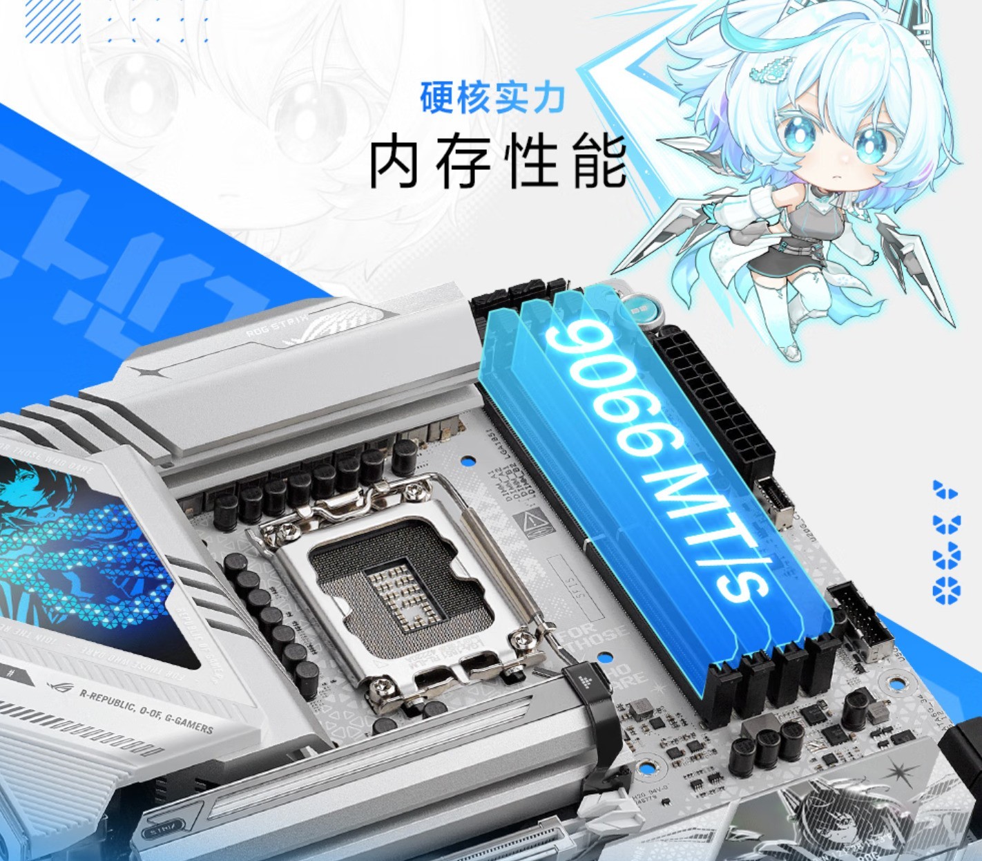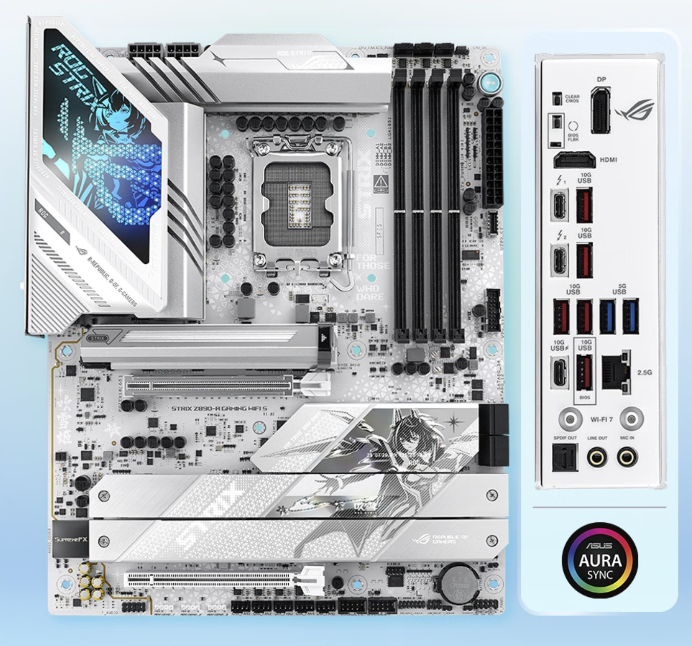 华硕 Z890-A GAMING WIFI S吹雪主板采用 ATX 板型,搭载Intel Z890芯片组与LGA1851接口,完美适配酷睿Ultra 200S全系列处理器,包括酷睿Ultra 9-285K旗舰型号。华硕 Z890-A GAMING WIFI S外观延续家族白色美学,白色PCB搭配银白战甲式散热装甲,芯片组散热片还有2.5D雪武战姬立绘,I/O装甲支持AURA SYNC神光同步,轻松打造次元风格主机。