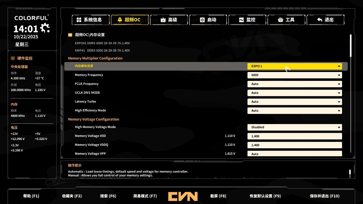 内存性能直接影响游戏帧率与多任务处理效率,七彩虹 B850M ARK FROZEN V14 方舟在内存配置上同样诚意满满。主板提供4条DDR5内存插槽,支持双通道内存,官方标称最高可支持8400MHz高频内存,同时兼容XMP/EXPO内存超频协议,无论是游戏玩家还是内容创作者,都能通过高频内存提升系统响应速度。