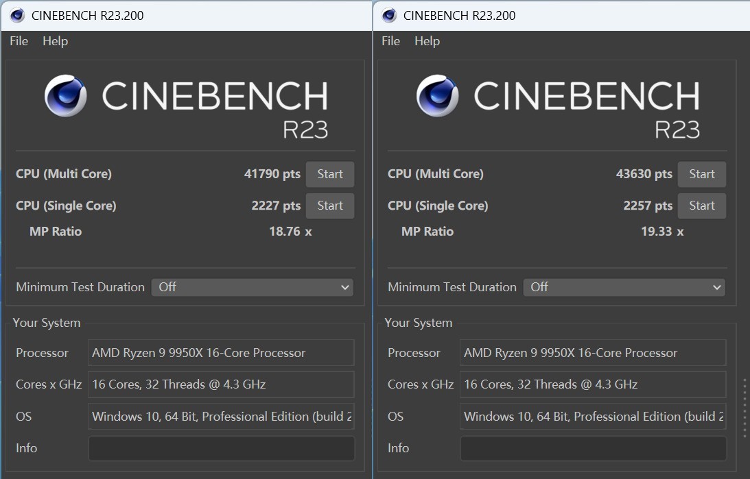 随后我们测试了性能优化前后平台的理论性能表现,以CINEBENCHR23的分数进行对比。因为X3D功能会影响多线程,所以这里我们使用AMD R9 9950X做测试。