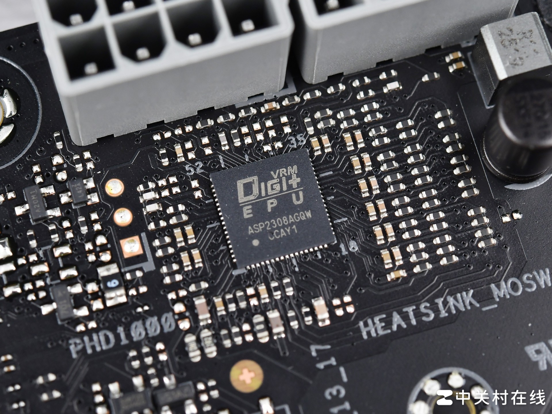 供电方面,华硕 TUF GAMING B850M-PLUS WIFI7主板维持了原本设计,搭载14+2+1供电模组,使用ASP2308定制PWM控制器,SPS供电,型号为AOZ53071QI,能输出80A,能跑满目前主流的锐龙9000系列处理器,搭配热门锐龙7 9800X3D这种处理器完全不在话下。