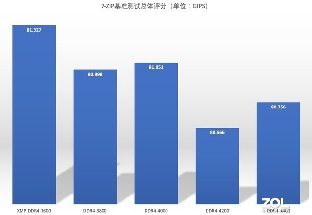 对于内存性能敏感的压缩软件,内存频率和延迟都会影响其基准测试结果。在7-Zip基准测试中,XPMDDR4-3600模式得分为81.327GIPS,由于Gear2模式和高时序限制了内存的性能,因此超频到DDR4-4400模式时,成绩降至80.756GIPS。