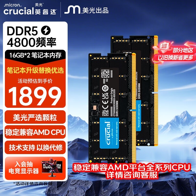 在京东,英睿达 32GB DDR5 4800内存条目前活动售价1899元,下单1件,实付低至1861元,原价1899元,现在到手只需1861元,赶紧行动起来为你的笔记本升级吧!
