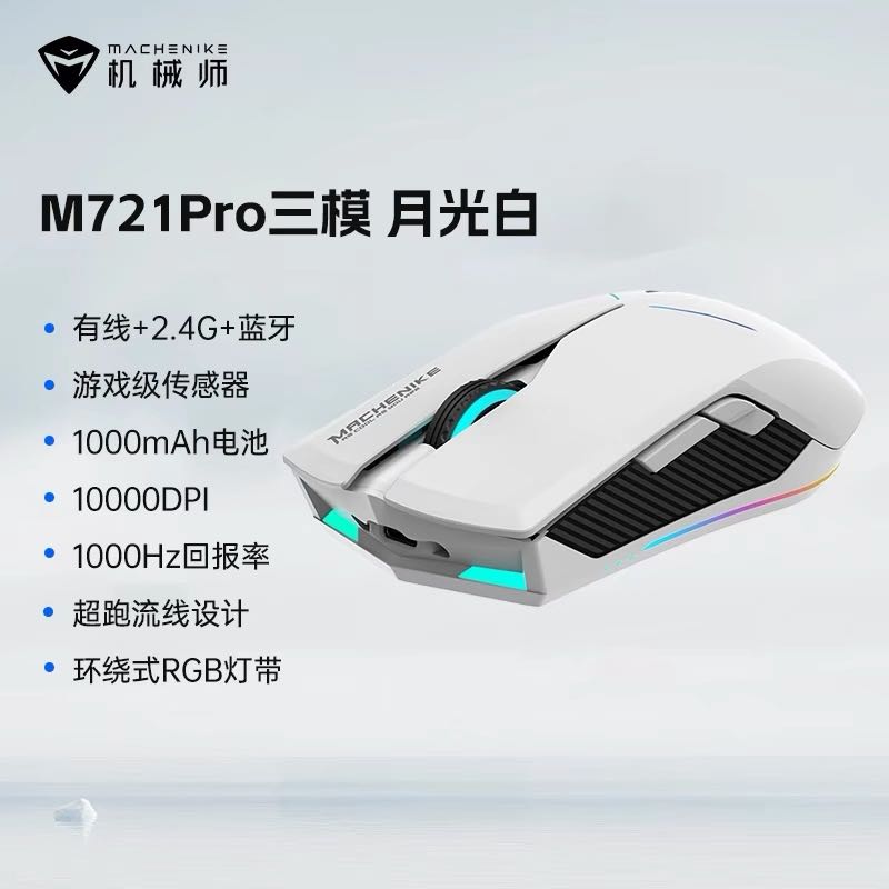 机械师 M721Pro采用黑色无线三模鼠标架构 基于对称式右手人体工学设计 ABS外壳搭配哑光涂层 提升握持防滑性 支持2.4G无线、蓝牙5.3与有线三模连接 适配PC、平板等多设备切换 内部搭载光学传感器 支持多档DPI调节 满足游戏与办公场景切换 左右键采用微动 确保高频点击反馈一致性。