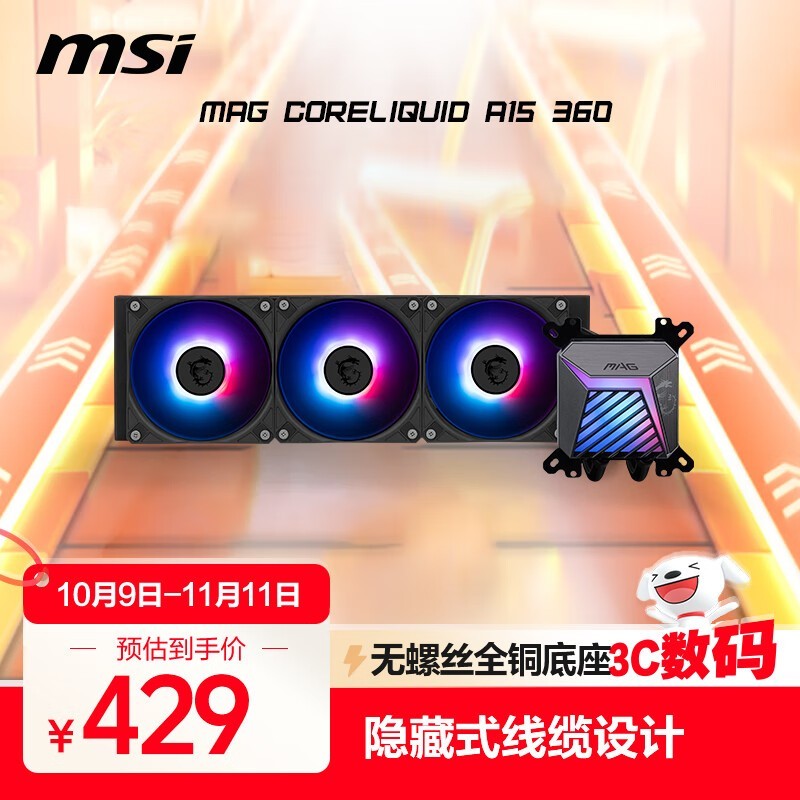 各位电脑爱好者们注意啦!双十一微星 A15 360一体式水冷大放价。这款水冷原价449元,现在双十一立减,只需429元。