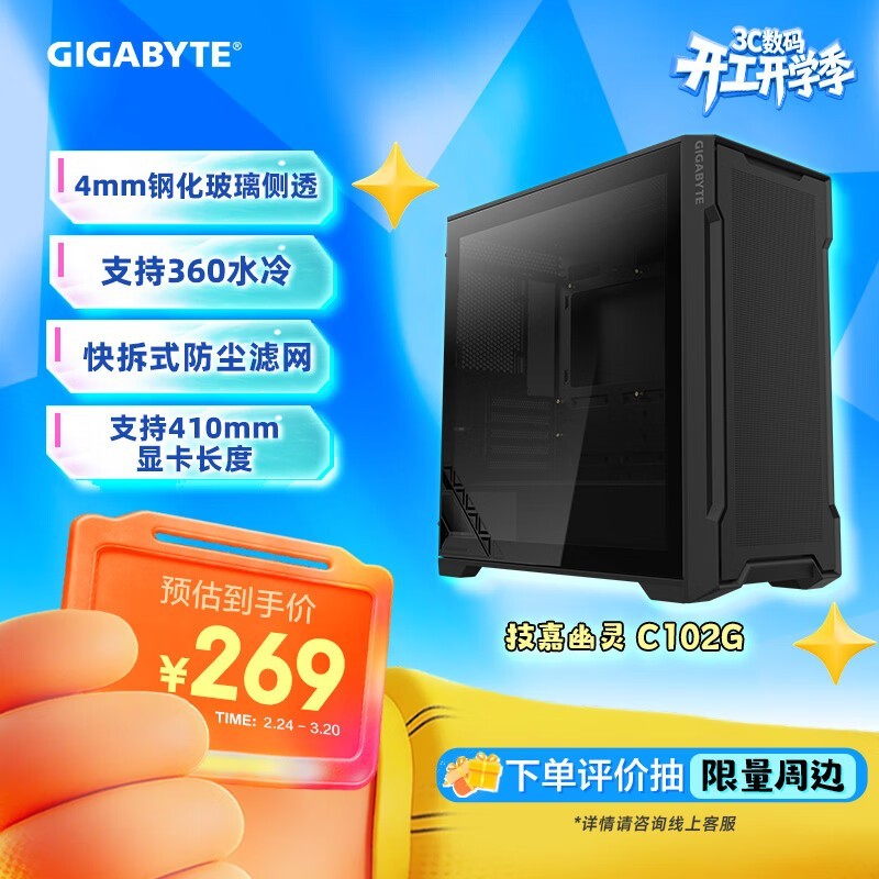 技嘉 幽灵C102G 蜂窝前进气格栅+415mm显卡限长,ATX中塔标准规格,性价比散热之选