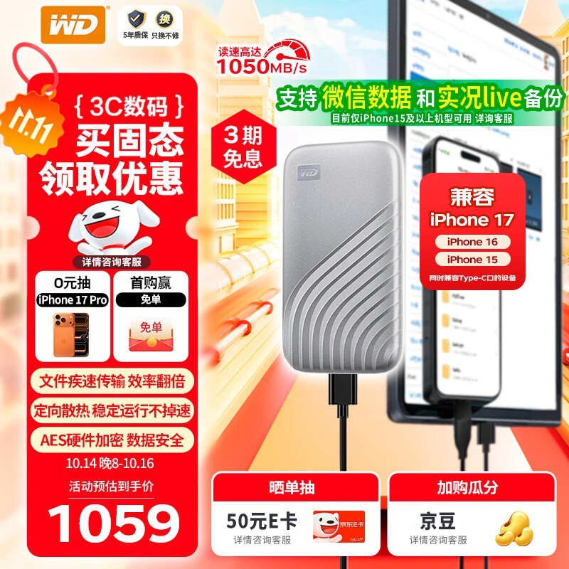 京东正在促销西部数据 My Passport随行SSD系列USB 3.2移动固态硬盘Type-C 2TB星河银WDBAGF0020BSL,西部数据 My Passport产品原价1079元,现在最终到手价仅1059元/件。西部数据 My Passport SSD随行SSD版外形紧凑纤薄,尺寸仅10 x 5.5 x 0.9cm,重约45克,方便收纳与携带。西部数据 My Passport全金属材质打造的机身较为圆润,尾部有流线型凹印处理,耐用性好,能抗1.98米垂直跌落冲击。它采用SSD固态硬盘,支持USB 3.2 Gen 2高速传输,最高读取速度达1050MB/s、写入速度达1000MB/s。西部数据 My Passport支持256位AES加密,兼容Win和Mac设备,即插即用。西部数据 My Passport还能通过专用程序实现快速备份和云备份数据,并且提供五年质保,喜欢就入手吧。