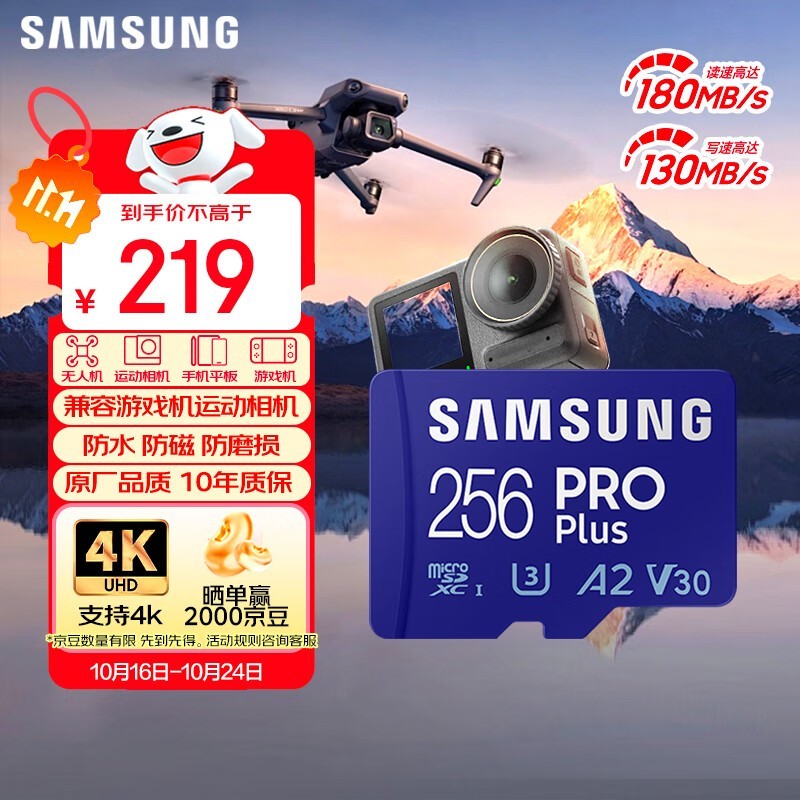 在京东,三星 PRO Plus存储卡目前活动售价219元,下单1件,收货好评返现2000京豆,折后实付低至198元。如果您需要高速读写大容量存储卡,选它准没错,不过要注意配套读卡器需与三星 PRO Plus存储卡匹配。