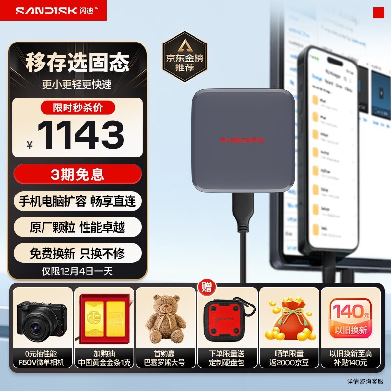 现在在京东购买,闪迪 ELE商品活动售价 1143 元,参与 plus 专享立减 9.6 元优惠活动,下单 1 件,实付低至 1133.40 元,赶快把它带回家吧!