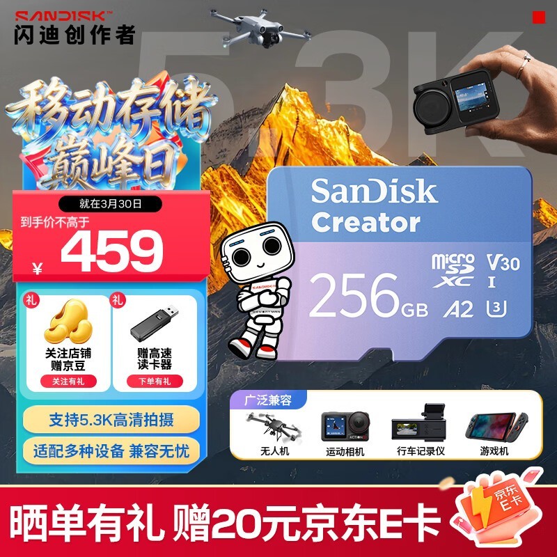 闪迪 创作者 256GB TF卡采用黑色microSD架构 基于3D NAND闪存 具备V30与UHS-I等级 针对高码率视频创作优化 读取速率最高达150MB/s 写入速率稳定90MB/s 支持4K/8K连续录制与高速连拍 适合相机、摄像机与无人机长时间素材采集 采用防水、防震、防磁与耐高低温防护。