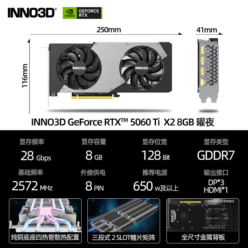 映众 RTX 5060Ti 曜夜 X2 基于全新架构,搭载 8GB GDDR6 显存,核心内流式多处理器针对 1080p 与 2K 游戏优化,可在主流光追场景中提供流畅帧率。曜夜 X2 双风扇散热系统配合多热管与大面积鳍片,确保高负载低温运行,外壳采用暗夜质感涂装,呈现低调科技美学。映众 RTX 5060Ti 曜夜 X2 在性能与外观辨识度上达成平衡。
